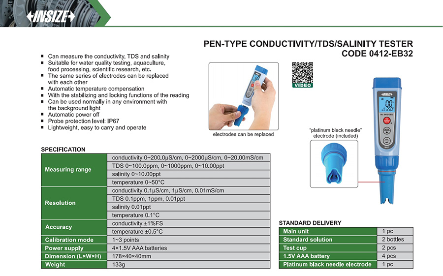 | 0412-EB32 | conductivity/TDS | off-line | 0~200.0μS/cm, 0~2000μS/cm, 0~20.00mS/cm, 0~100.0ppm, 0~1000ppm, 0~10.00ppt, 0~10.00ppt, 0~50°C | no |