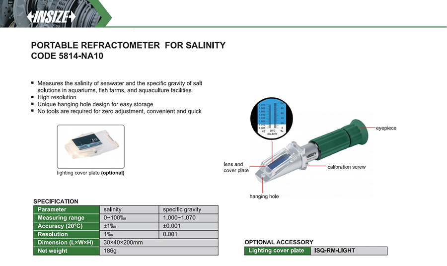 Measures the salinity of seawater and the specific gravity of salt solutions in aquariums, fish farms, and aquaculture facilities