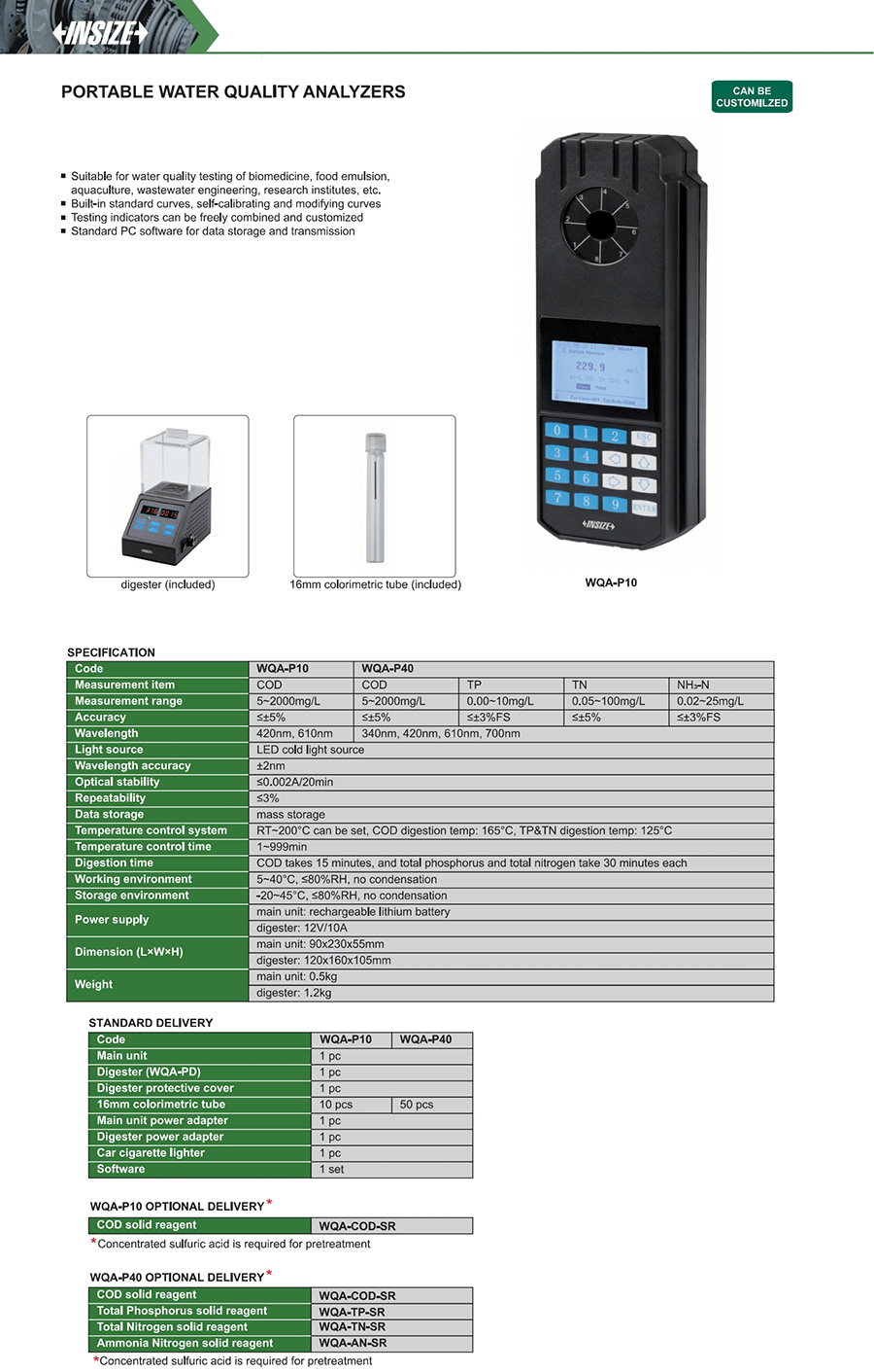 WQA-P10 5~2000mg/L ≤±5% 420nm, 610nm COD
