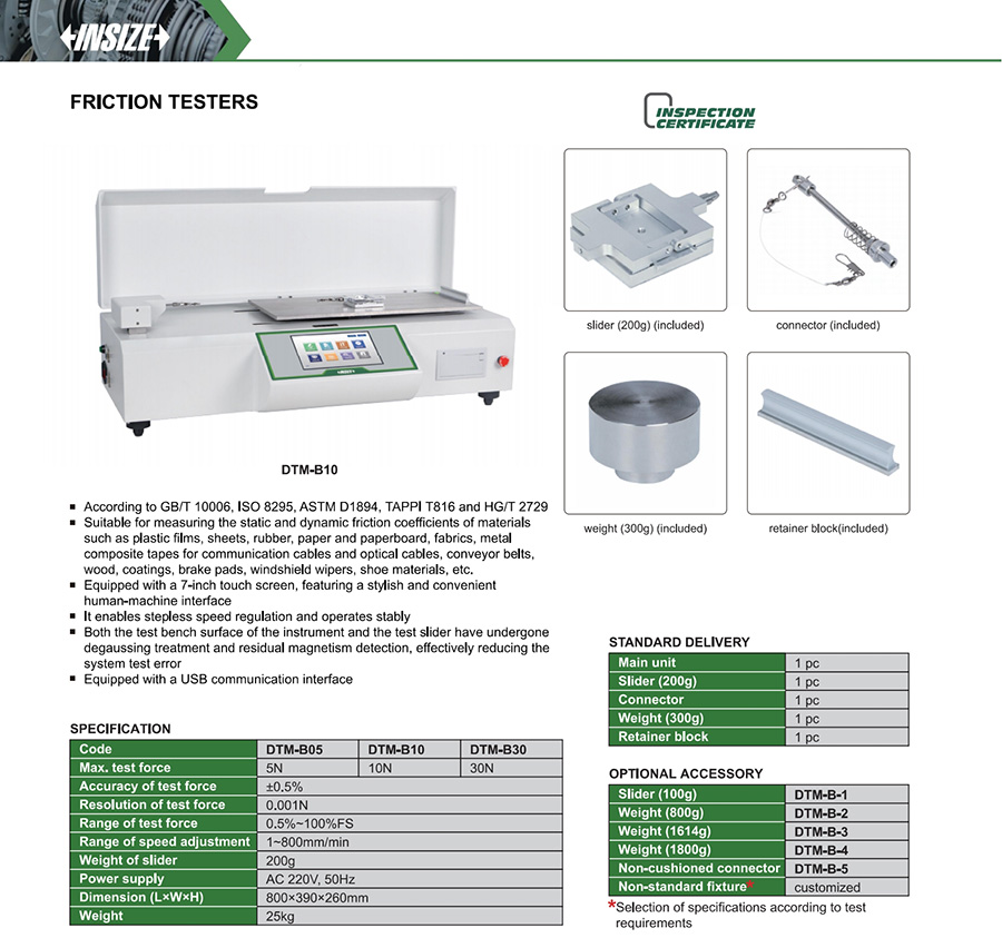 Suitable for measuring the static and dynamic friction coefficients of materials such as plastic films, sheets, rubber, paper and paperboard, fabrics, metal composite tapes for communication cables and optical cables, conveyor belts, wood, coatings, brake pads, windshield wipers, shoe materials, etc.