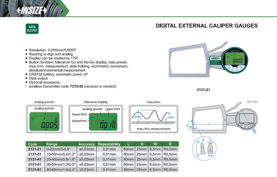 | 2131-21 | 0-20mm/0-0.8" | ±0.03mm | 0.005mm/0.0002" |