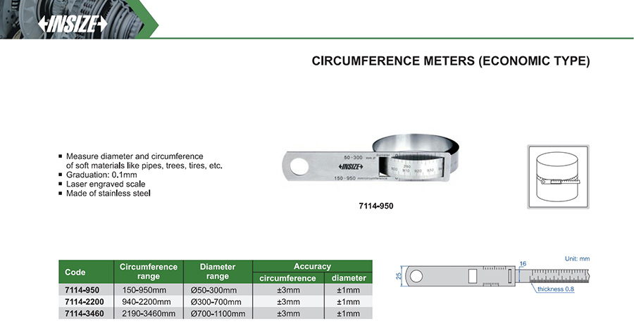 | Code | Graduation | Diameter range | Circumference range | Circumference accuracy | Diameter accuracy |
