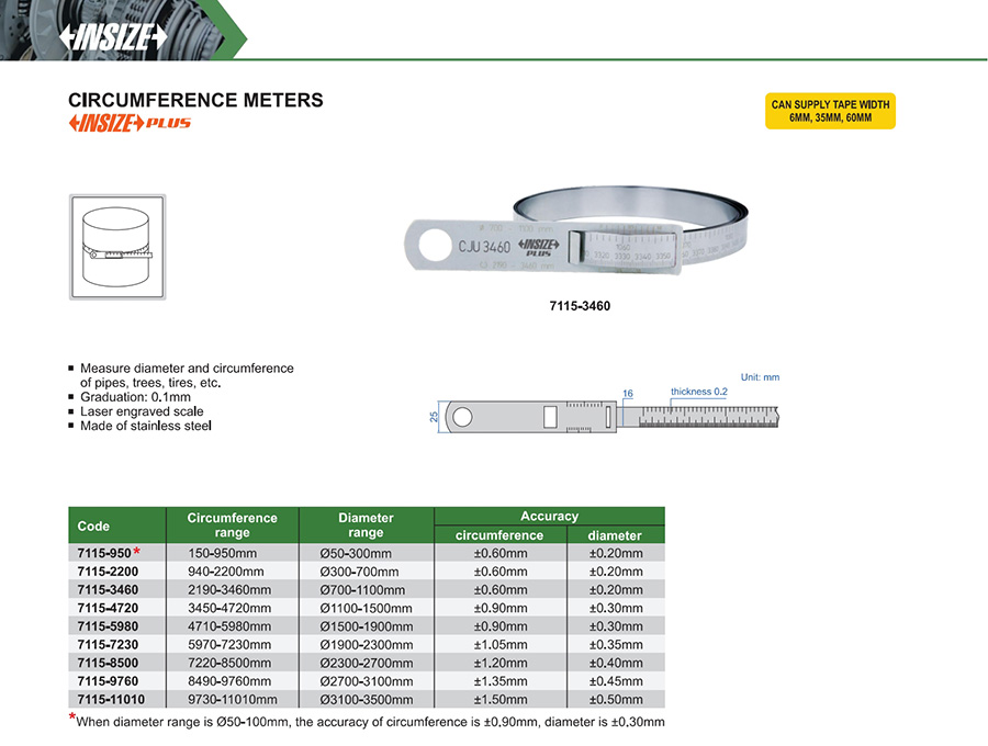 | Code | Graduation | Diameter range | Circumference range | Circumference accuracy | Diameter accuracy |