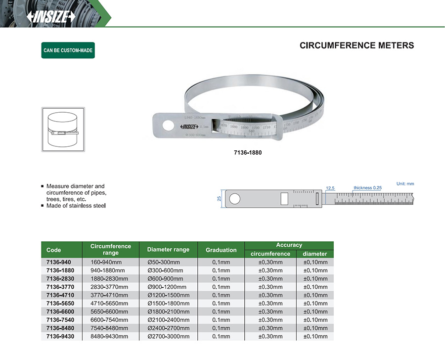 | Code | Graduation | Diameter range | Circumference range | Circumference accuracy | Diameter accuracy |