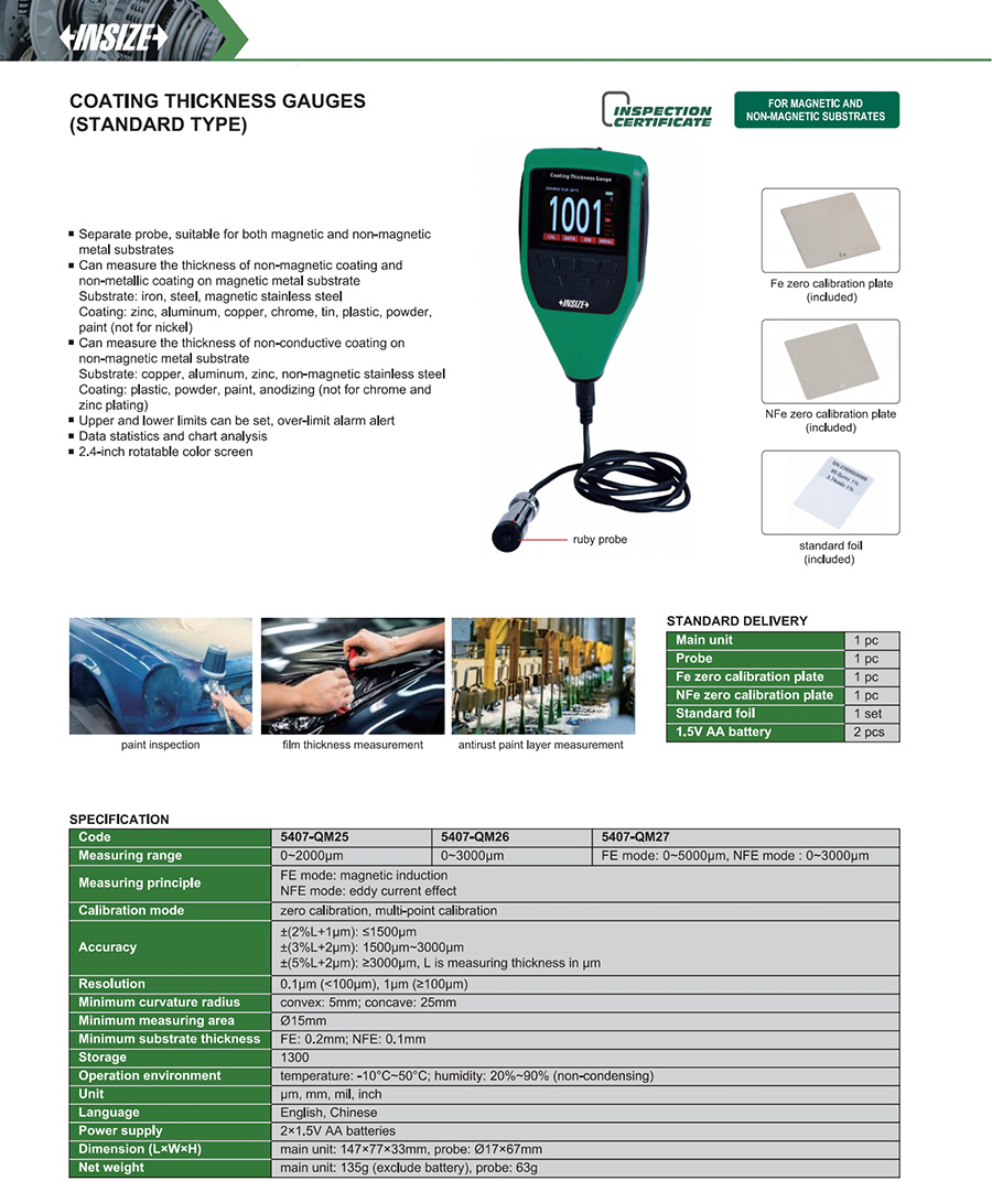 | 5407-QM27 | FE mode: 0~5000μm, NFE mode : 0~3000μm | ±(2%L+1µm): ≤1500µm, ±(3%L+2µm): 1500µm~3000μm, ±(5%L+2µm): ≥3000μm | 0.1μm (<100μm), 1μm (≥100μm) | no |