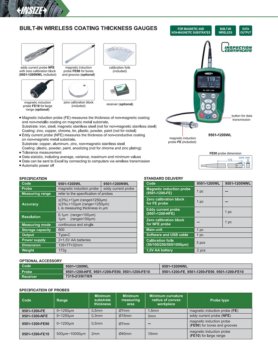 | 9501-1200WL | 0~1250μm | ±(3%L+1)μm (range≤1250μm), ±(3%L+10)μm (range>1250μm) | 0.1μm (range<100μm), 1μm (range≥100μm) | Type-C |