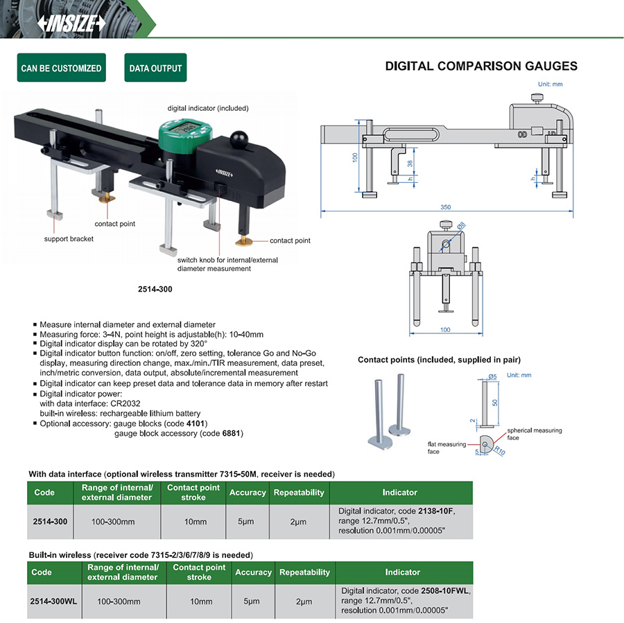 Digital indicator button function: on/off, zero setting, tolerance Go and No-Go display, measuring direction change, max./min./TIR measurement, data preset,inch/metric conversion, data output, absolute/incremental measurement