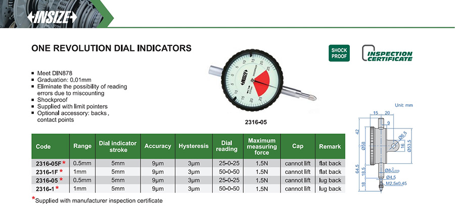 | 2316-05F | 0.5mm | 9µm | 0.01mm |