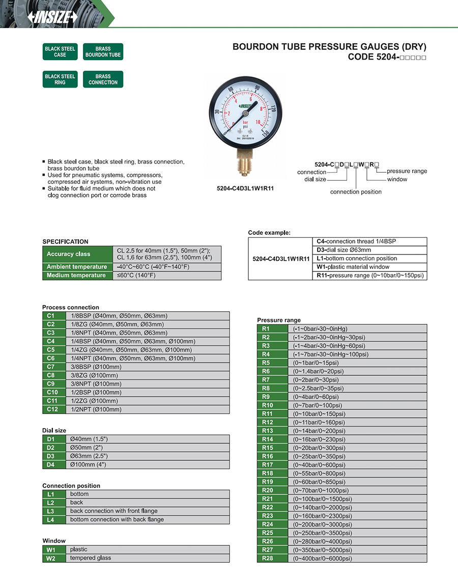 | 5204 | 1/8BSP, 1/8ZG, 1/8NPT, 1/4BSP, 1/4ZG, 1/4NPT, 3/8BSP, 3/8ZG, 3/8NPT, 1/2BSP, 1/2ZG, 1/2NPT | Ø40mm, Ø50mm, Ø63mm, Ø100mm | bottom, back, back connection with front flange, bottom connection with back flange | plastic, tempered glass |