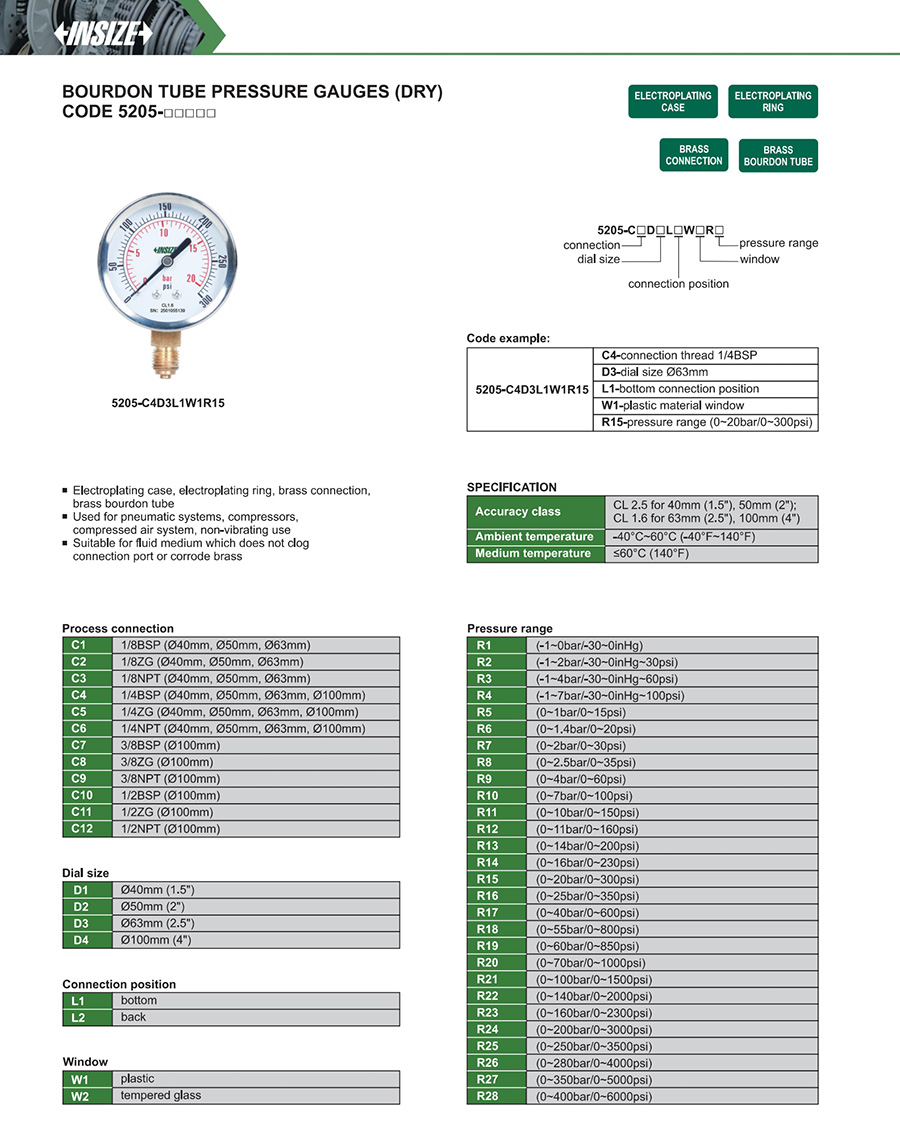 | 5205 | 1/8BSP, 1/8ZG, 1/8NPT, 1/4BSP, 1/4ZG, 1/4NPT, 3/8BSP, 3/8ZG, 3/8NPT, 1/2BSP, 1/2ZG, 1/2NPT | Ø40mm, Ø50mm, Ø63mm, Ø100mm | bottom, back | plastic, tempered glass |