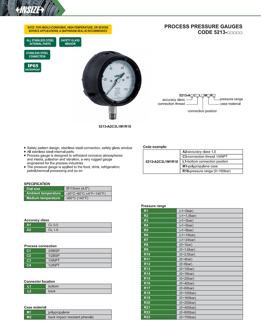 | 5213 | 3/8BSP, 1/2BSP, 1/4NPT, 1/2NPT | Ø115mm | bottom, back | safety glass |