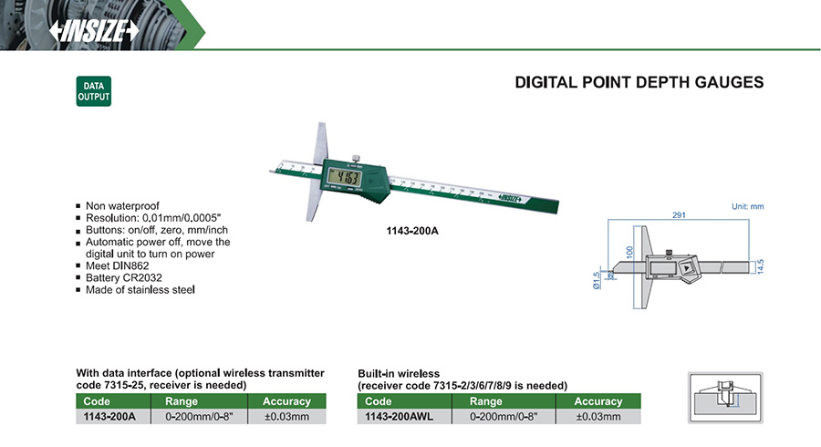 | 1143-200AWL | 0-200mm/0-8" | ±0.03mm | 0.01mm/0.0005" | built-in wireless |
