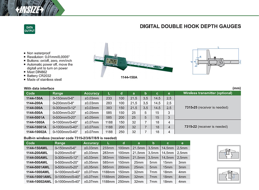 | 1144-150A | 0-150mm/0-6" | ±0.03mm | 0.01mm/0.0005" | with data interface |