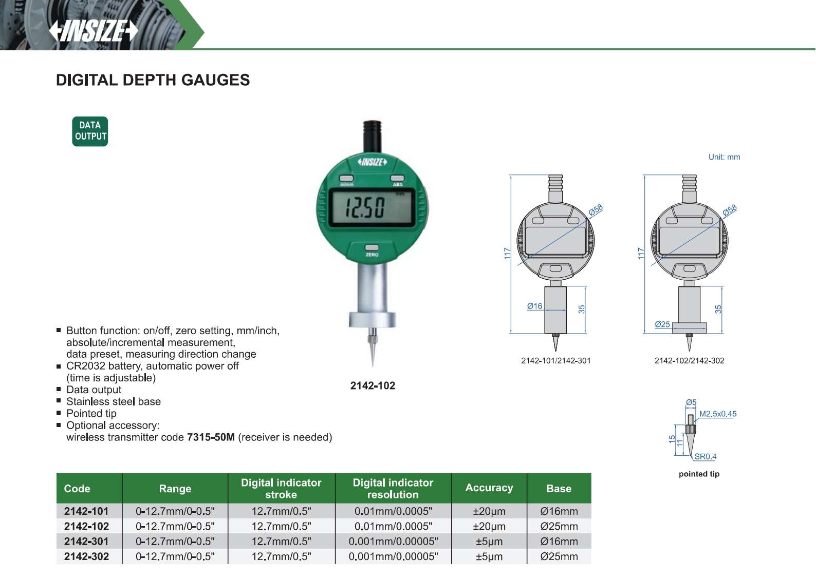 | 2142-102 | 0-12.7mm/0-0.5" | ±20µm | 0.01mm/0.0005" | with data interface |
