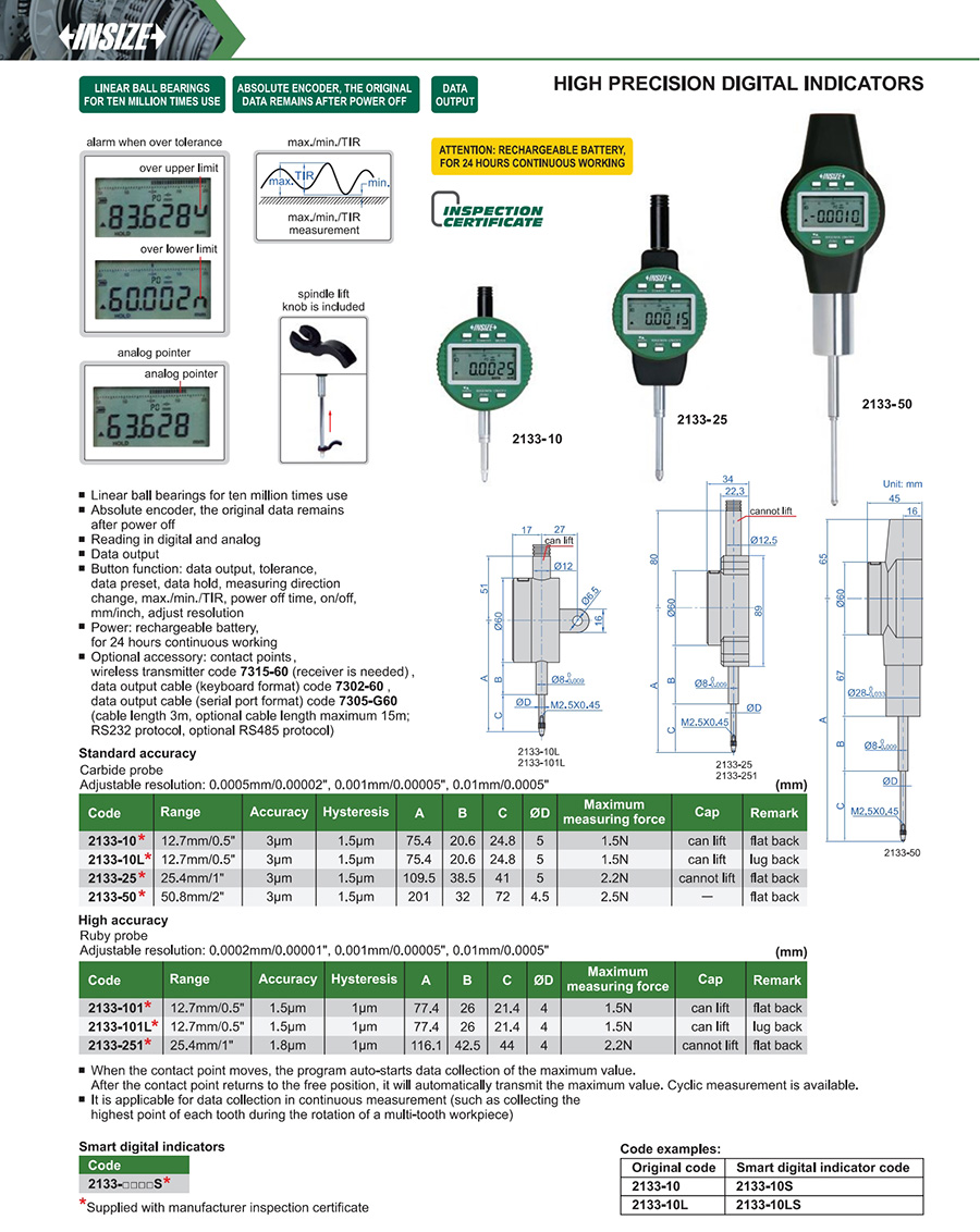 | 2133-251 | 25.4mm/1" | 1.8µm | 0.0002mm/0.00001" |