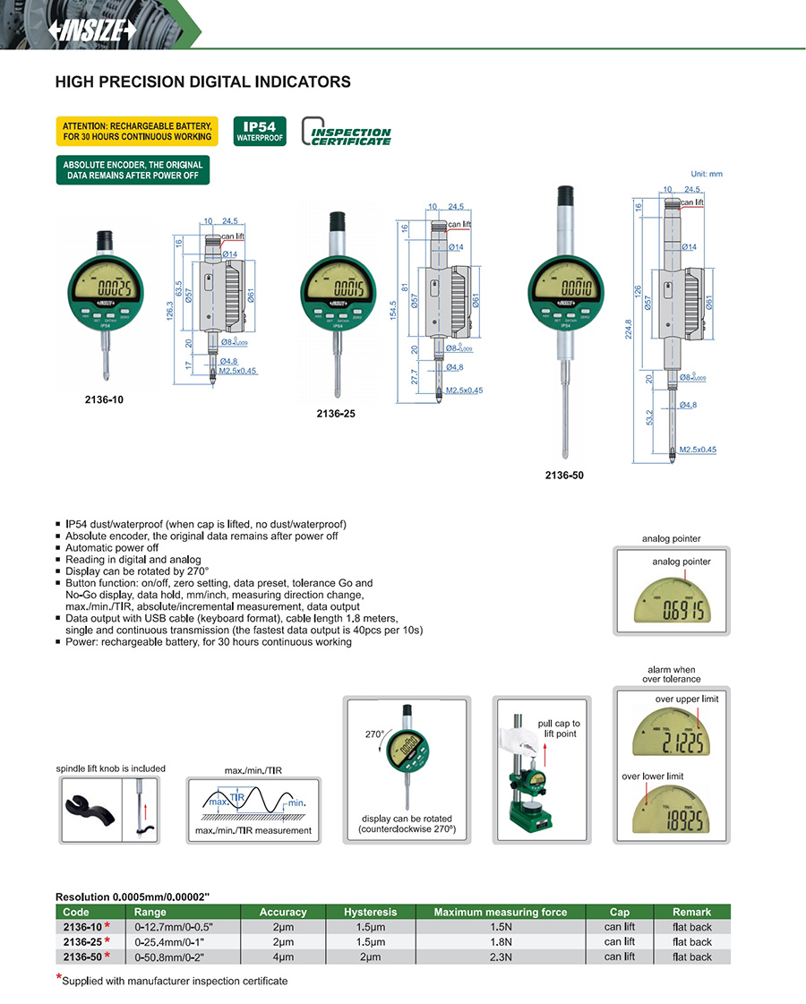 | 2136-50 | 0-50.8mm/0-2" | 4µm | 0.0005mm/0.00002" |