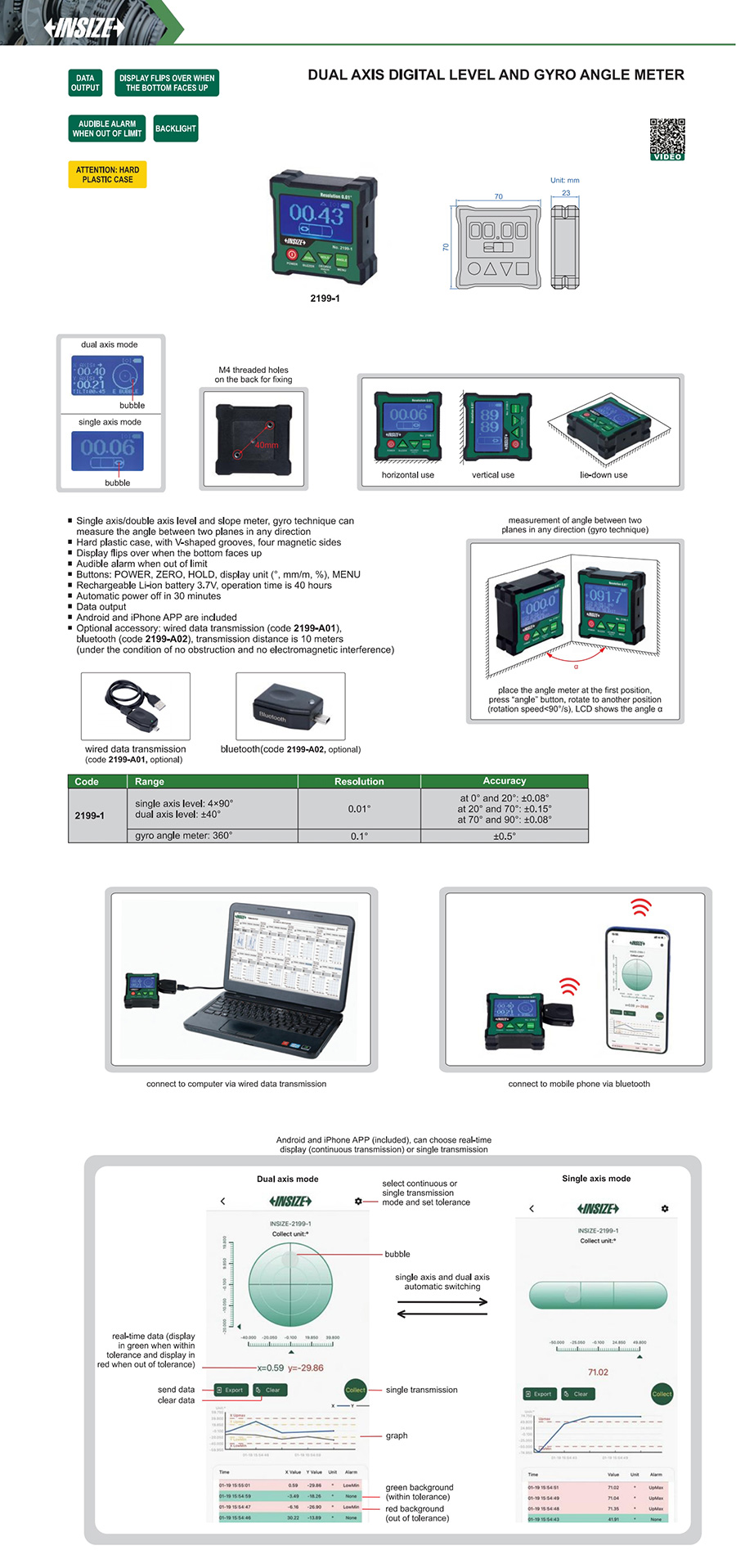 | 2199-1 | single axis level: 4×90°;dual axis level: ±40° | at 0° and 20°: ±0.08°;at 20° and 70°: ±0.15°;at 70° and 90°: ±0.08° | 0.01° | no |