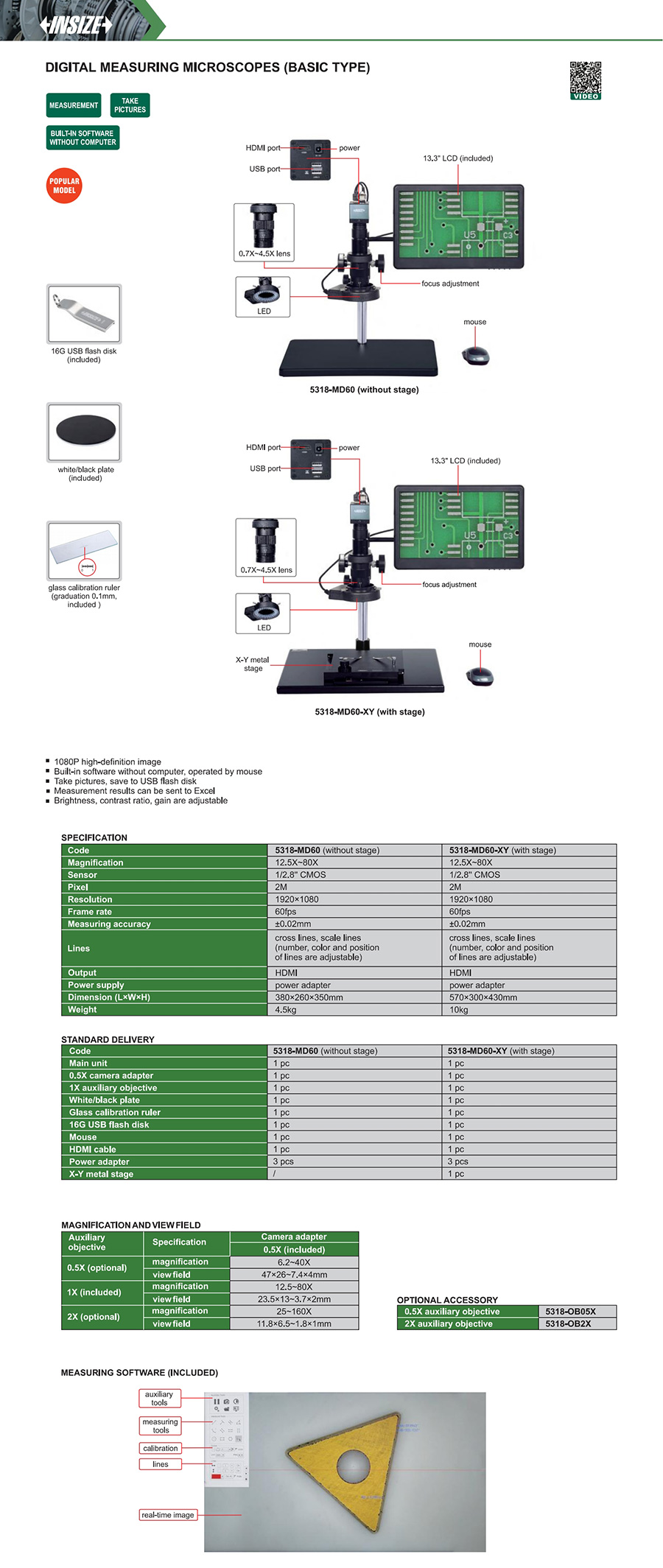 | 5318-MD60 | digital measuring microscopes | 12.5X~80X | 23.5×13~3.7×2mm | 2M |