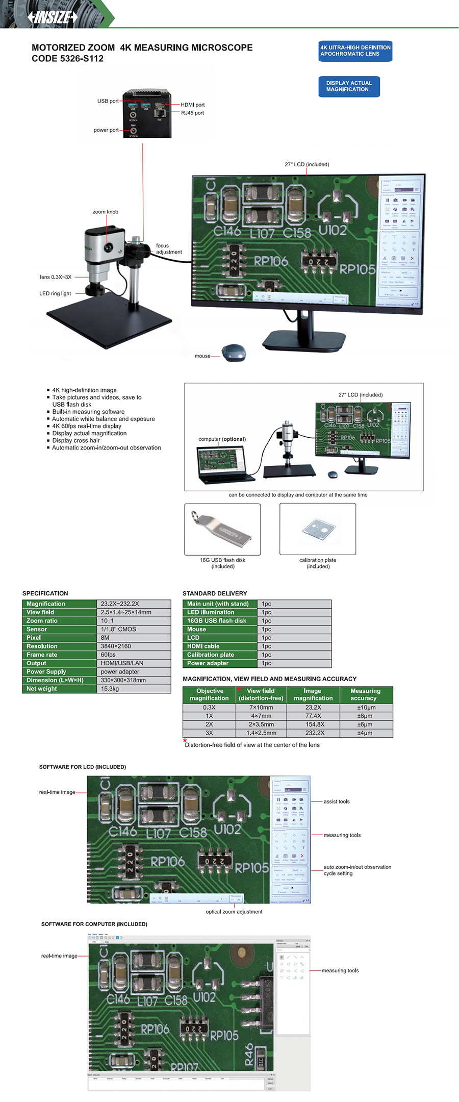 | 5326-S112 | digital measuring microscopes | 23.2X~232.2X | 7x10mm, 4x7mm, 2x3.5mm, 1.4x2.5mm | 8M |