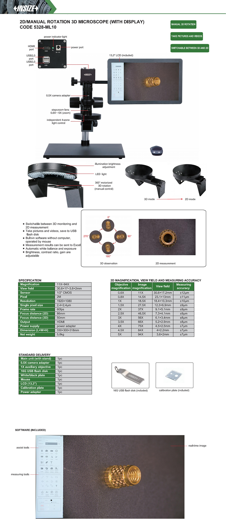 | 5328-ML10 | 2D/manual rotation 3D microscope | 11X~94X | 30.6×17~3.6×2mm | 2M |