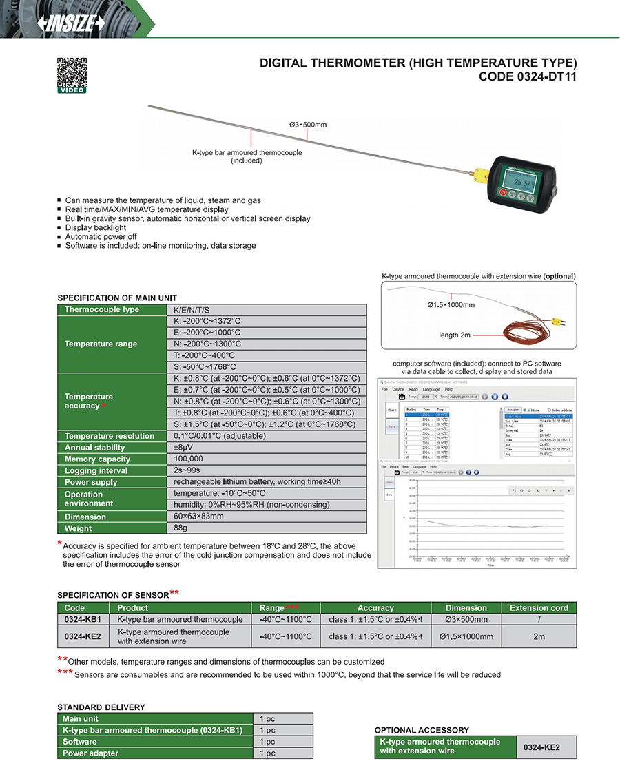 | 0324-DT11 | K | thermocouple | ±0.8°C (at -200°C~0°C); ±0.6°C (at 0°C~1372°C) | 1 | yes | -200°C~1372°C |