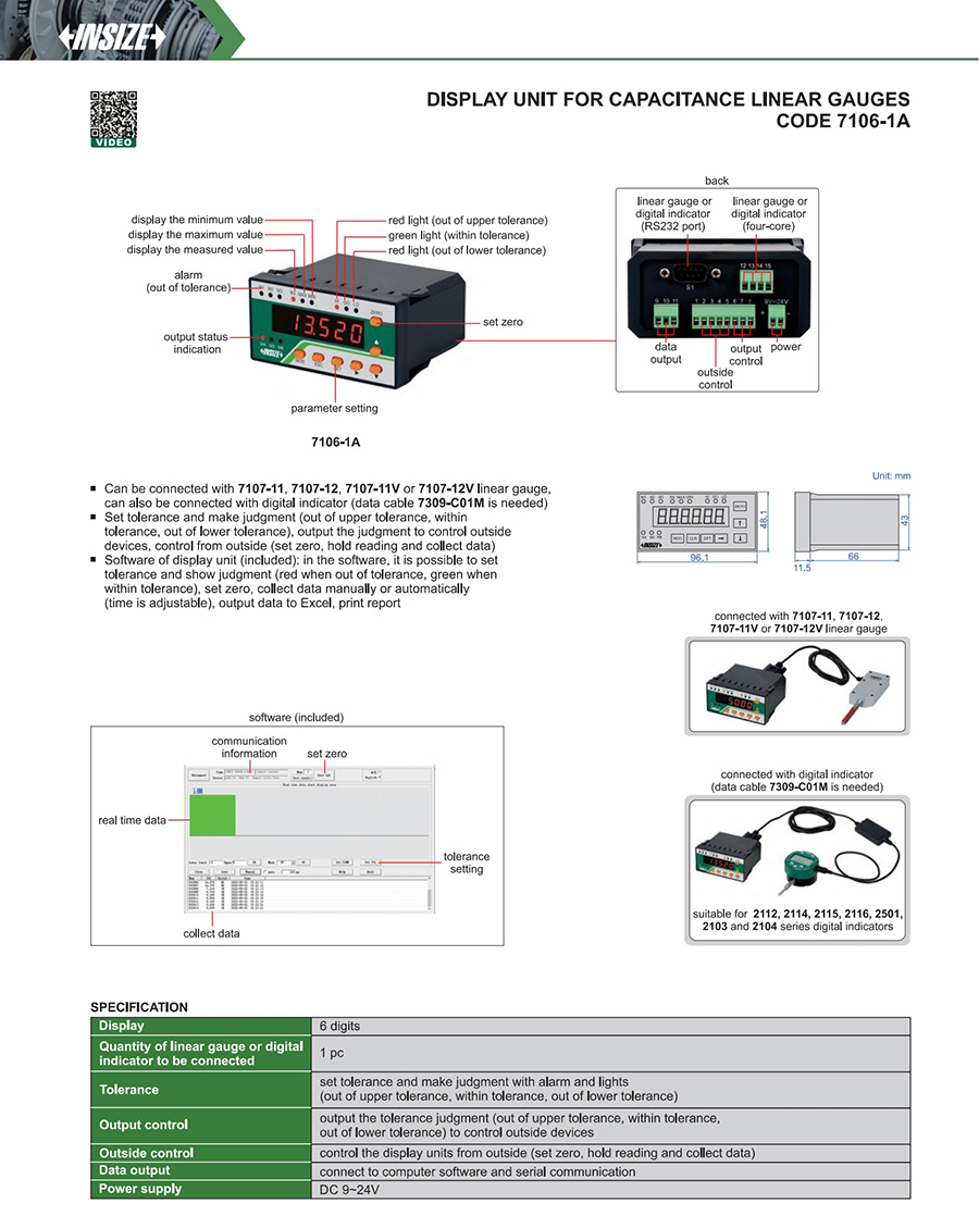 Can be connected with 7107-11, 7107-12, 7107-11V or 7107-12V linear gauge, can also be connected with digital indicator (data cable 7309-C01M is needed)