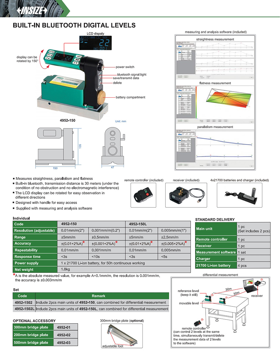 | 4952-150 | ±5mm/m | ±(0.01+2%A) | 0.01mm/m (2") | 0.01mm/m |