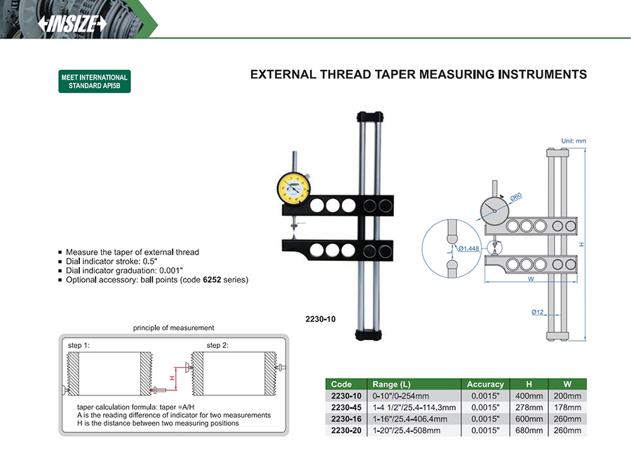 | 2230-10 | 0-10"/0-254mm | 0.0015" | 0.001" | taper |