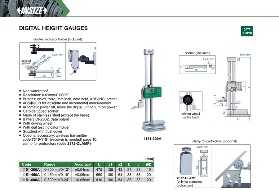 | 1151-300A | 0-300mm/0-12" | ±0.04mm | 0.01mm/0.0005" |