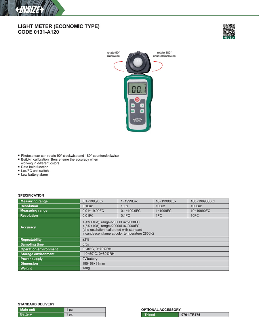 | 0131-A120 | 0.1~199900Lux/0.1~19990FC | 0.1Lux/1Lux/10Lux/100Lux, 0.01FC/0.1FC/1FC/10FC |
