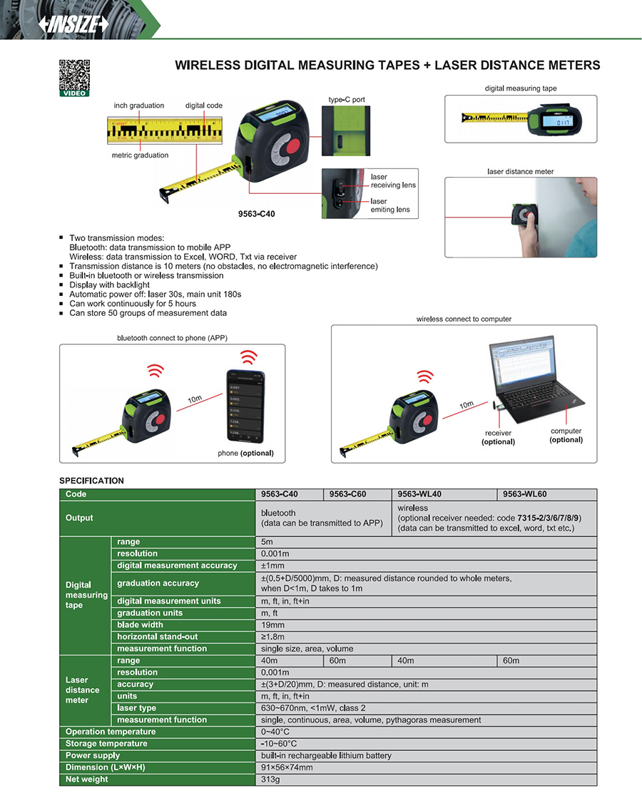 9563-WL40 Laser distance meter:40m Laser distance meter:±(3+D/20)mm wireless