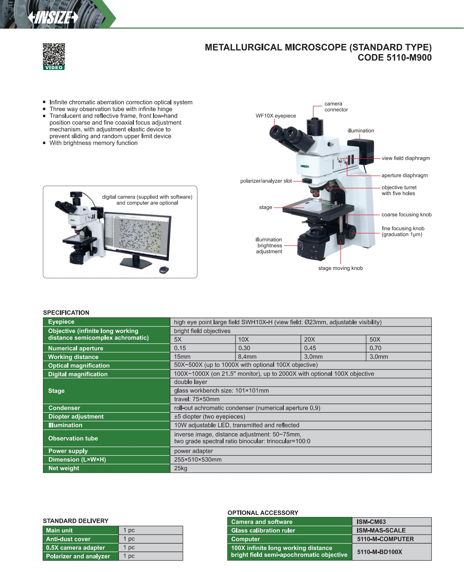 | 5110-M900 | glass workbench size: 101×101mm, travel: 75×50mm | 50X~500X | high eye point large field SWH10X-H | bright field |