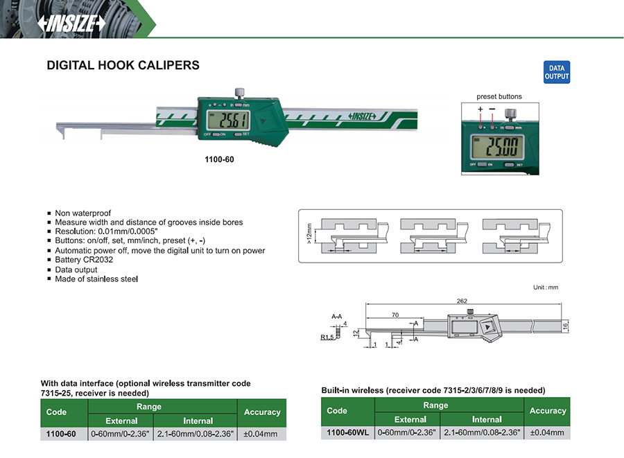 | 1100-60 | external 0-60mm/0-2.36", internal 2.1-60mm/0.08-2.36" | ±0.04mm | 0.01mm/0.0005" | with data interface |