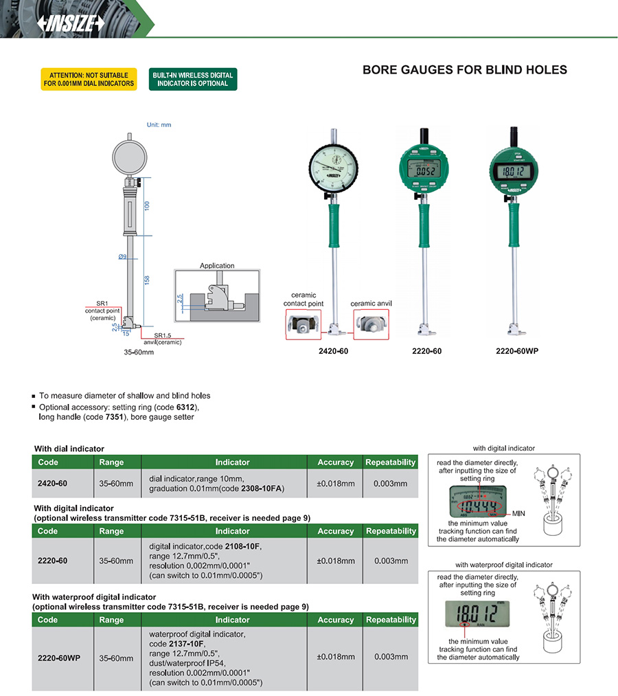 | 2220-60WP | 35-60mm | ±0.018mm | 0.003mm | with waterproof digital indicator |
