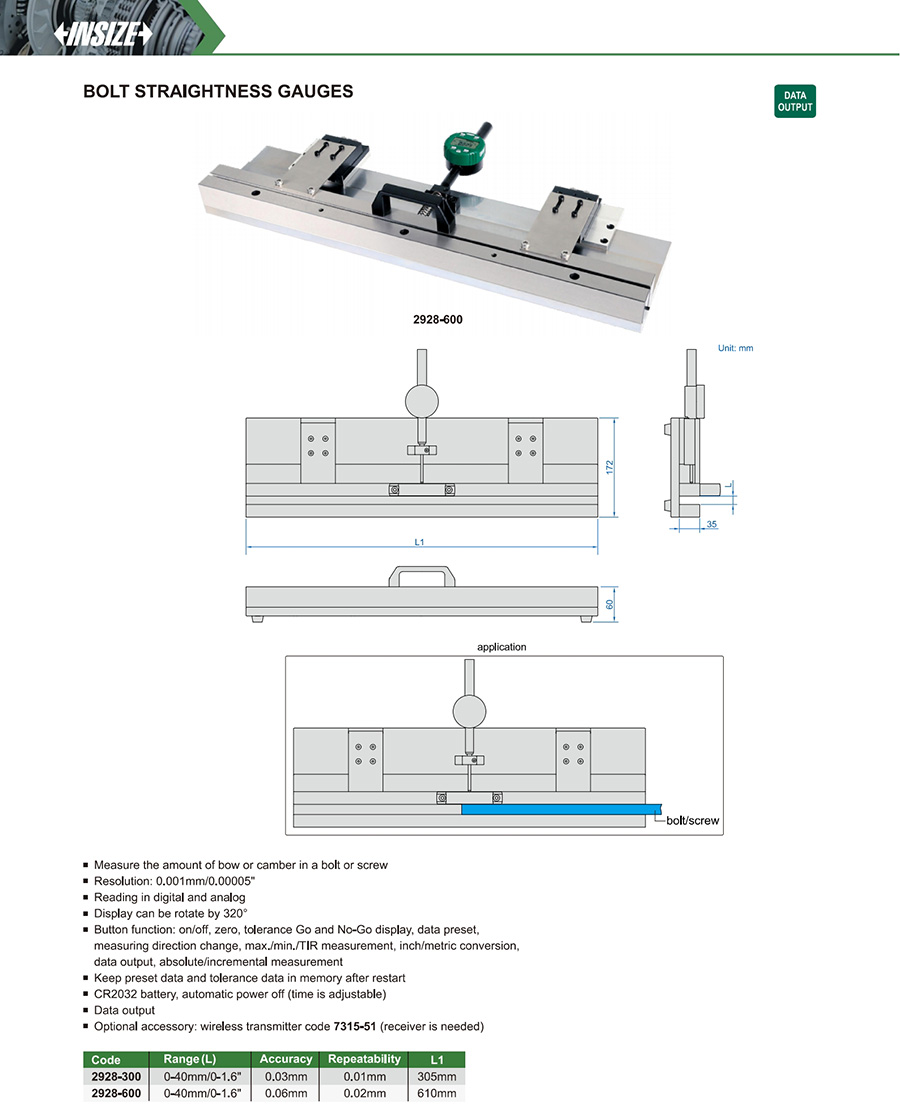 | 2928-600 | 0-40mm/0-1.6" | 0.06mm | 0.001mm/0.00005" |