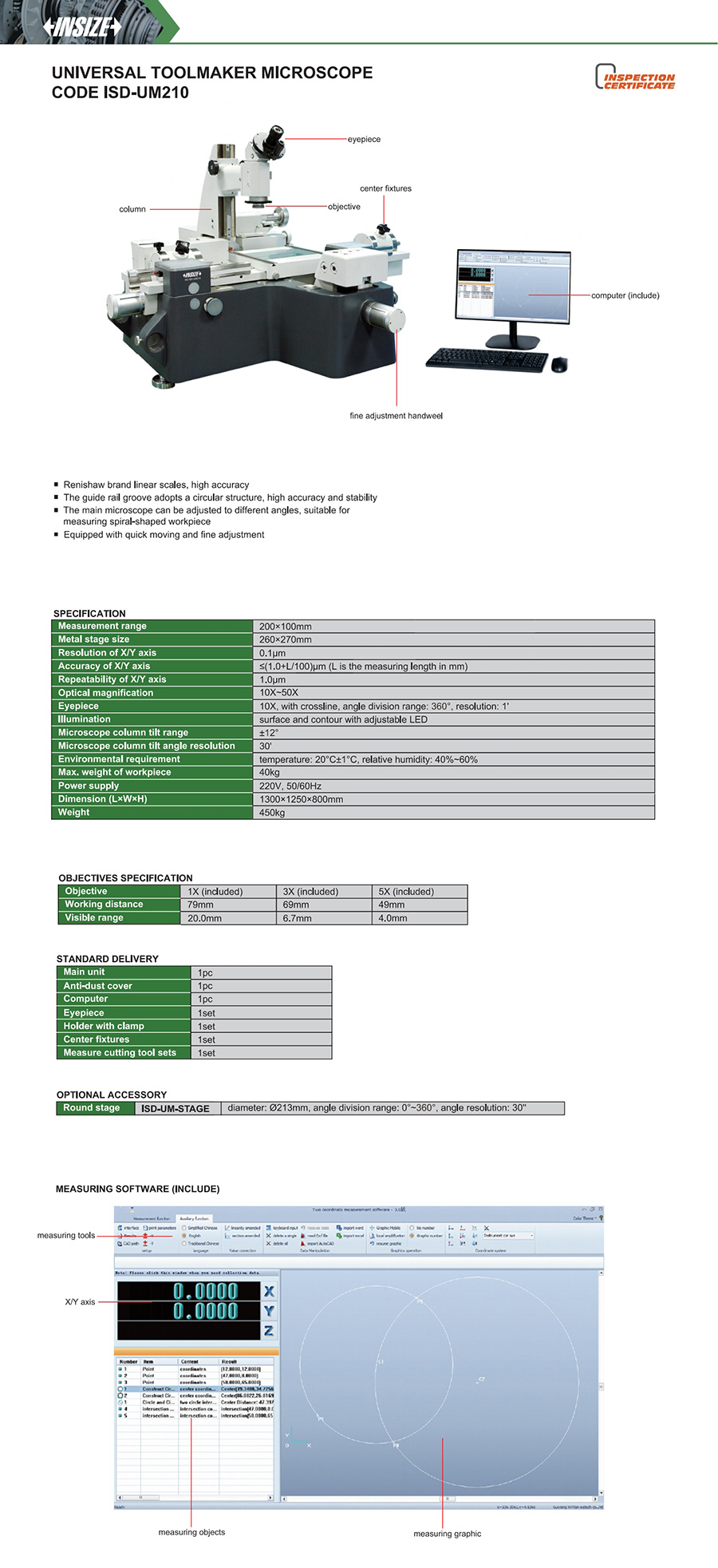 ISD-UM210 200×100mm ≤(1.0+L/100)µm 0.1µm 1.0µm 10X~50X 40kg