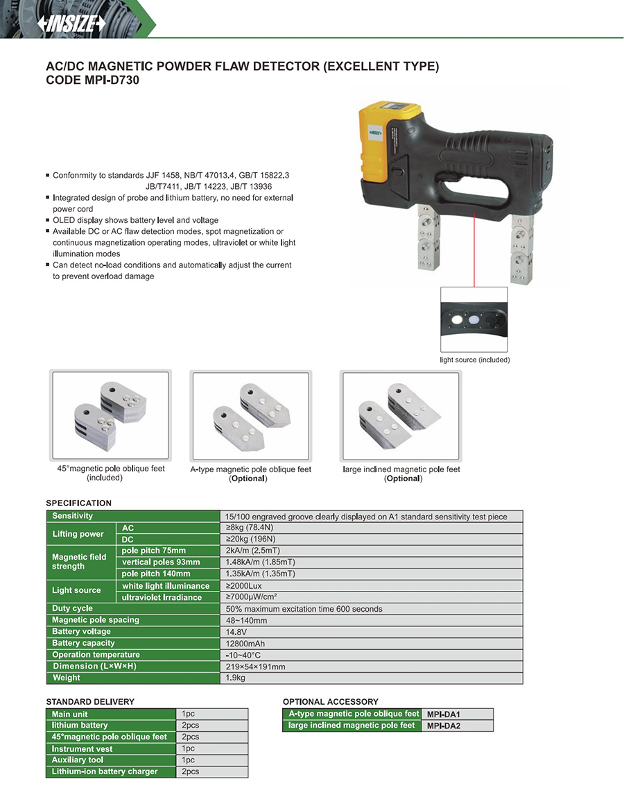 MPI-D730 15/100 engraved groove clearly displayed on A1 standard sensitivity test piece AC ≥8kg (78.4N), DC ≥20kg (196N) 48~140mm