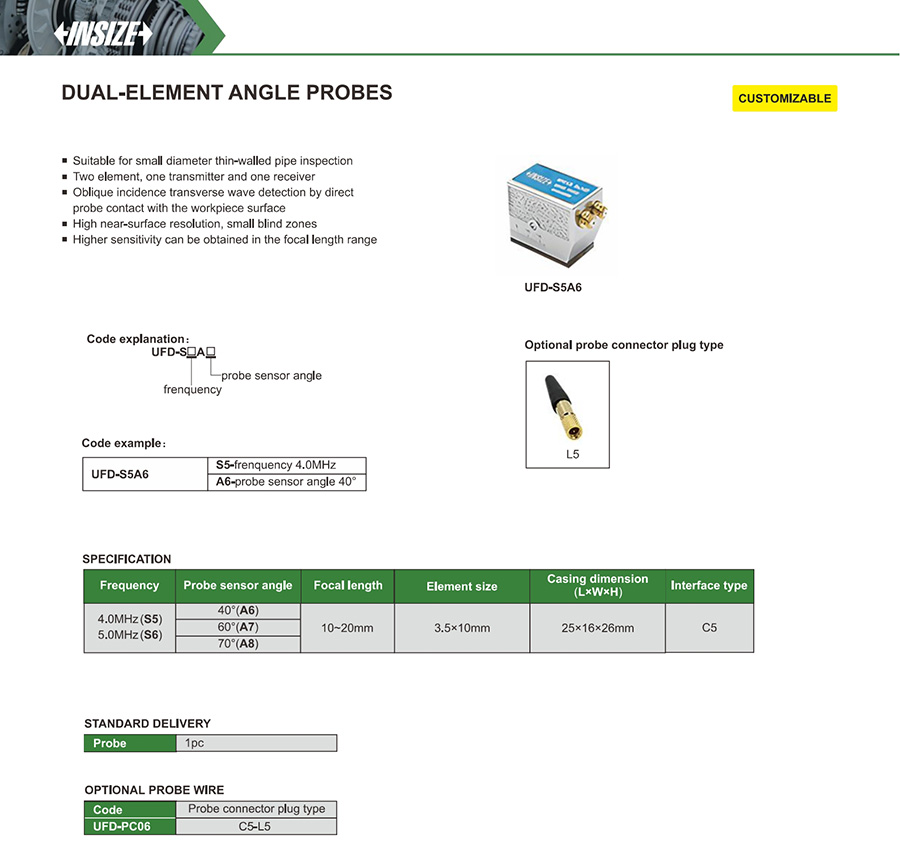 | UFD-S□A□ | 4.0MHz(S5), 5.0MHz(S6) | 40°(A6), 60°(A7), 70°(A8) | 10~20mm | 3.5x10mm | C5 |
