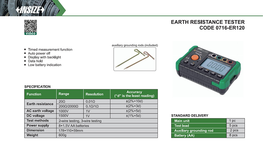 | 0716-ER120 | 20Ω/200Ω/2000Ω | 1000V | 1500V | 2-wire testing, 3-wire testing |
