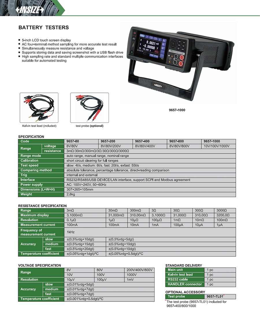 | 9657-200 | 3mΩ/30mΩ/300mΩ/3Ω/30Ω/300Ω/3000Ω | 8V/80V/200V |