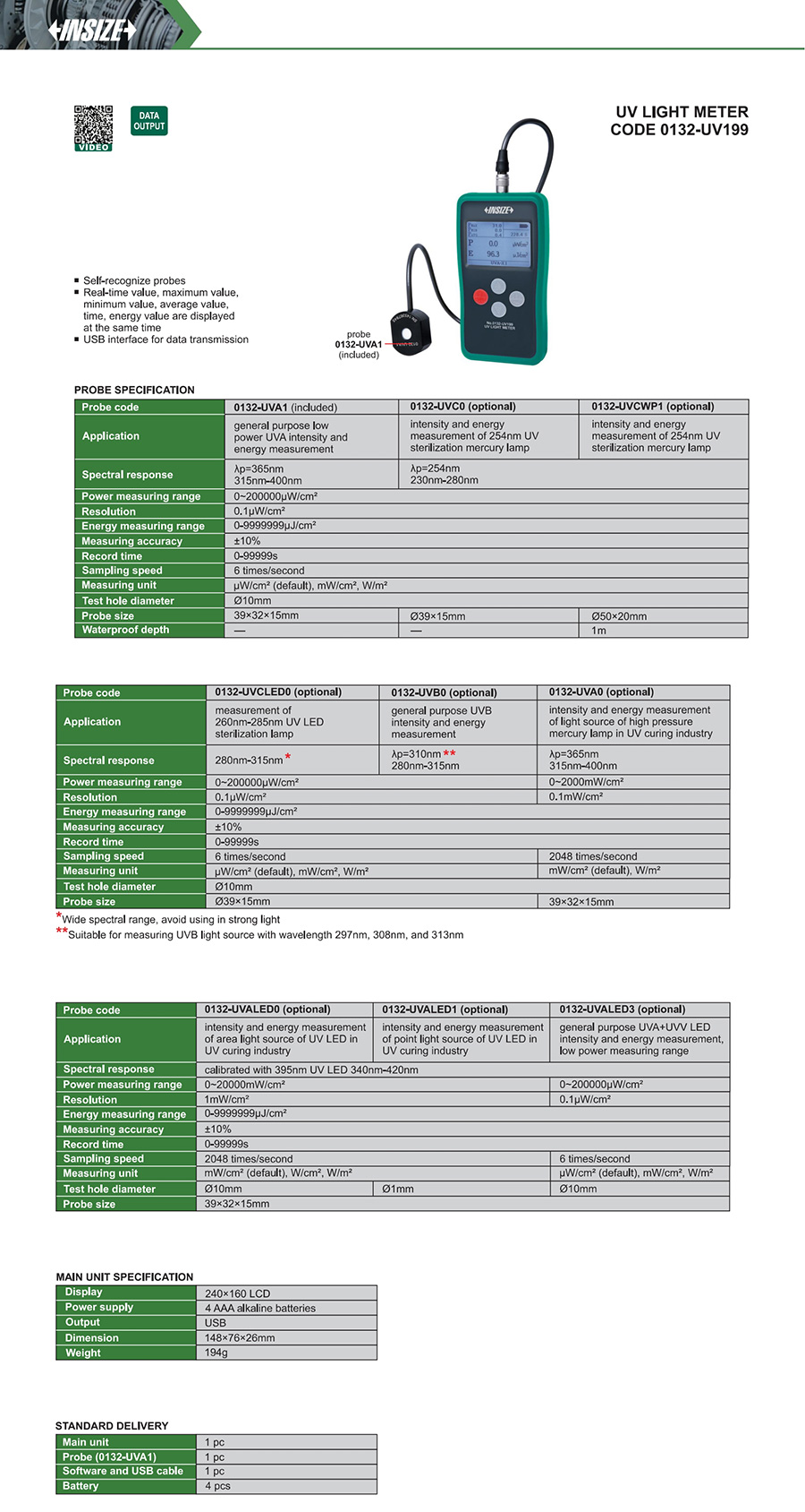 | 0132-UVA199 | general purpose low power UVA intensity and energy measurement | Power:0~200000µW/cm² | Test hole:Ø10mm | Probe:39×32×15mm |