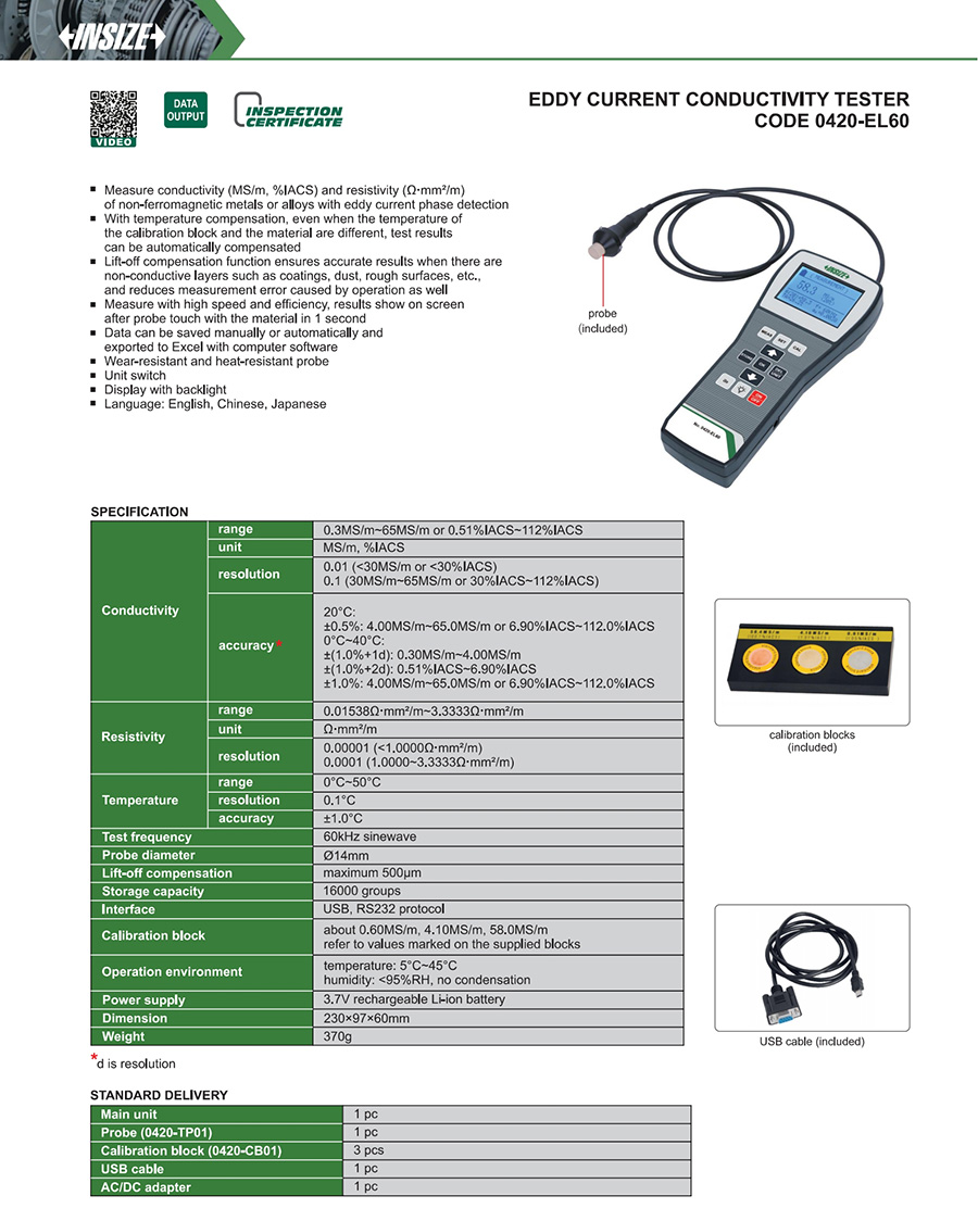 | 0420-EL60 | Conductivity:0.3MS/m~65MS/m or 0.51%IACS~112%IACS | Conductivity:0.5%(20℃)* |