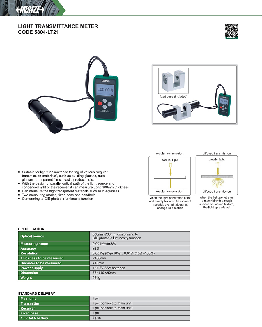 Suitable for light transmittance testing of various “regular transmission materials”, such as building glasses, auto glasses, transparent films, plastic products, etc.
