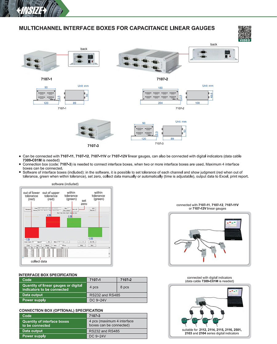 Can be connected with 7107-11, 7107-12, 7107-11V or 7107-12V linear gauges, can also be connected with digital indicators (data cable 7309-C01M is needed)