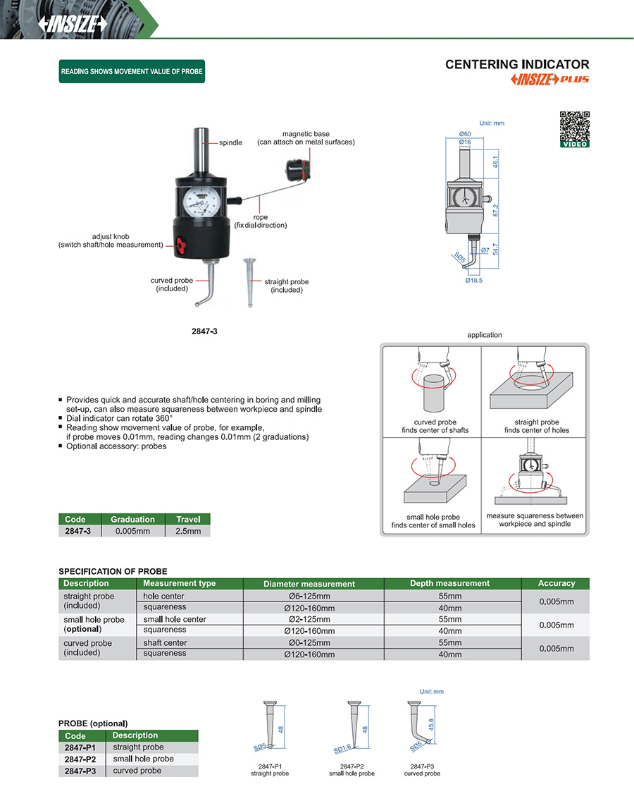 Provides quick and accurate shaft/hole centering in boring and milling set-up, can also measure squareness between workpiece and spindle