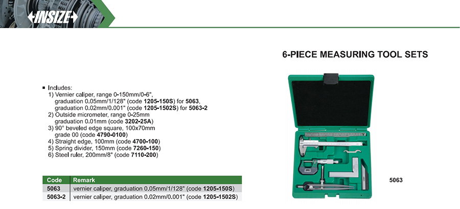 Vernier caliper, range 0-150mm/0-6", graduation 0.05mm/1/128" (code 1205-150S) for 5063, graduation 0.02mm/0.001" (code 1205-1502S) for 5063-2
