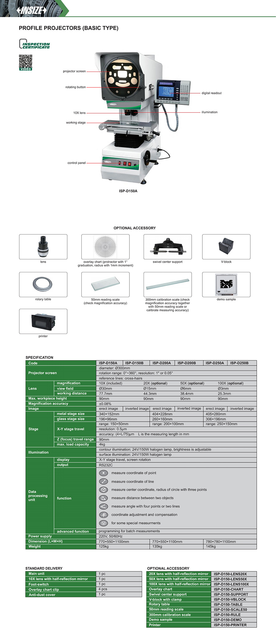 | ISP-D150A | vertical | 150×50mm | (4+L/75)µm | 0.5µm | not included | Ø300mm | erect image |