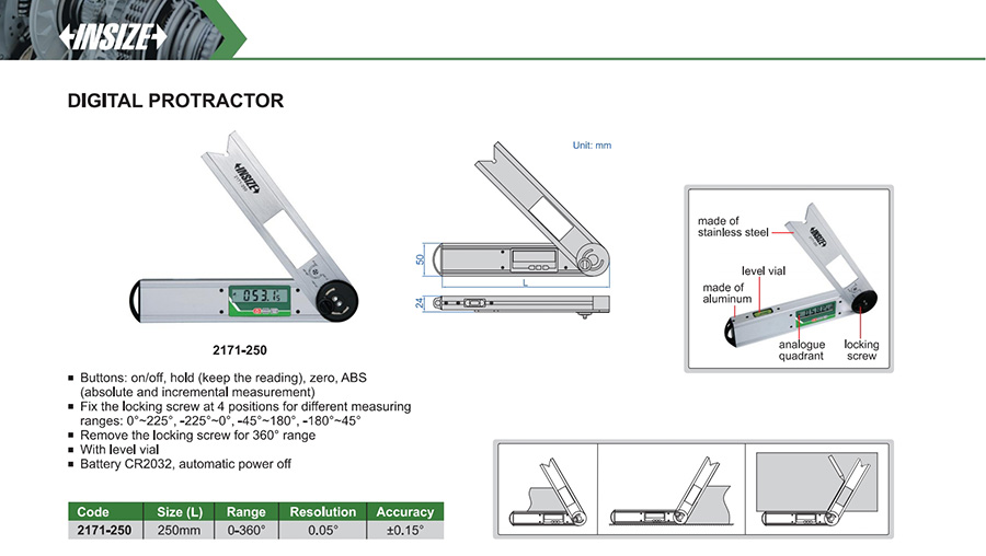 Fix the locking screw at 4 positions for different measuring ranges: 0°~225°, -225°~0°, -45°~180°, -180°~45°