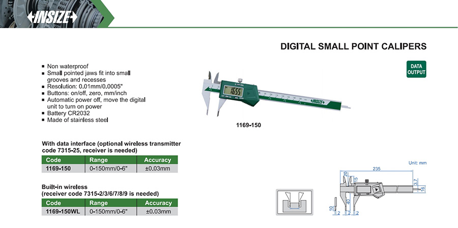 | 1169-150WL | 0-150mm/0-6" | ±0.03mm | 0.01mm/0.0005" | built-in wireless |