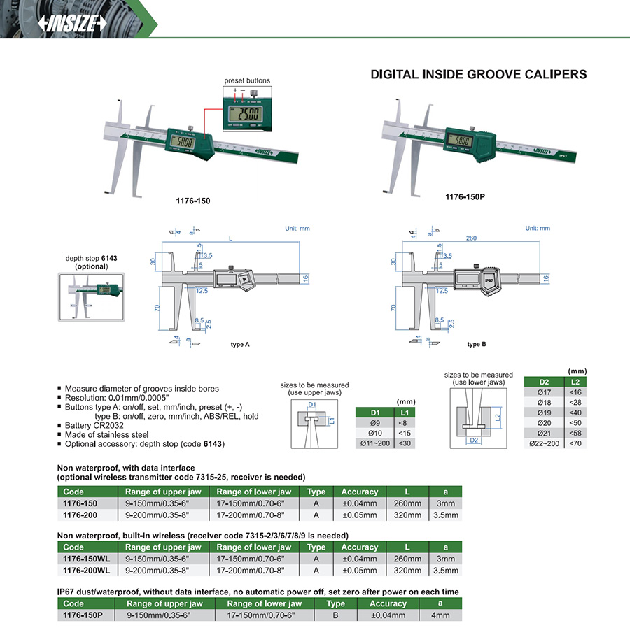 | 1176-150 | A | 9-150mm/0.35-6" | 17-150mm/0.70-6" | ±0.04mm | 0.01mm/0.0005" | with data interface |